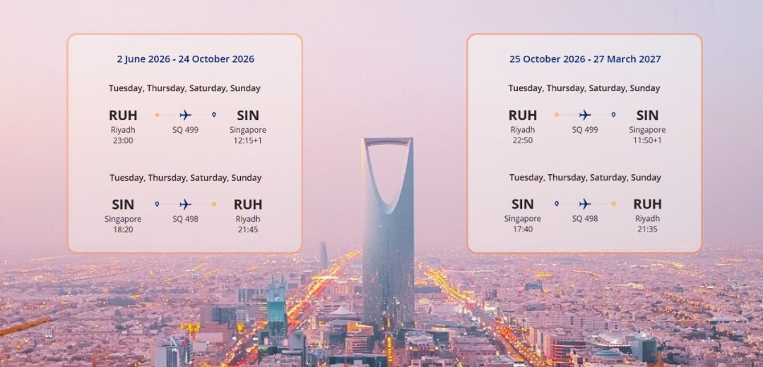 The inaugural non‑stop service between Singapore and Riyadh launches on 2 June 2026 with below flight schedule. Flight timings displayed are in local time, subject to regulatory approvals.