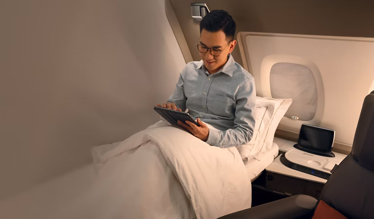 A 32” HD touchscreen monitor paired with Bang & Olufsen noise-cancelling headphones and an enhanced KrisWorld entertainment system that saves* your playlists and preferences for future flights. In addition, stay in touch with loved ones with complimentary Internet connectivity. For once, you’ll wish the flight was longer.