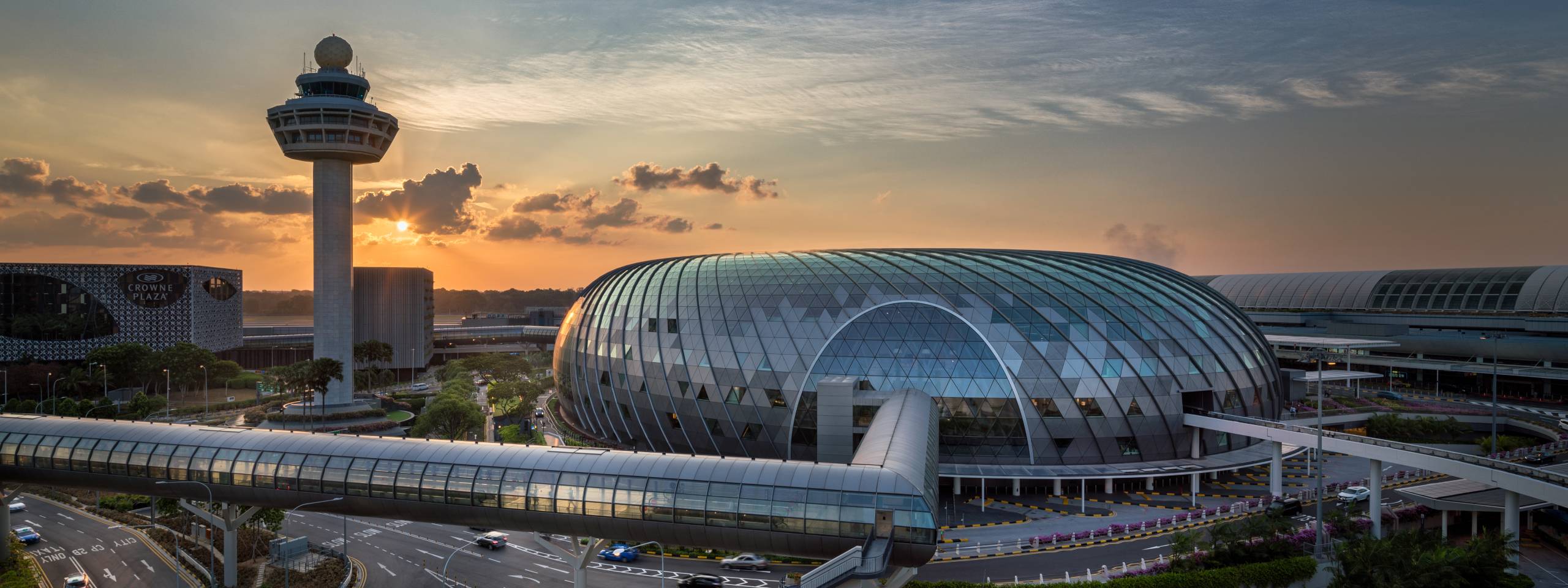 ターミナルから直結する総合施設ジュエル。緑豊かな屋内庭園、世界最大級の屋内の滝、多彩なショッピング&飲食店がすべて壮大なガラスドームの中に収まっています。